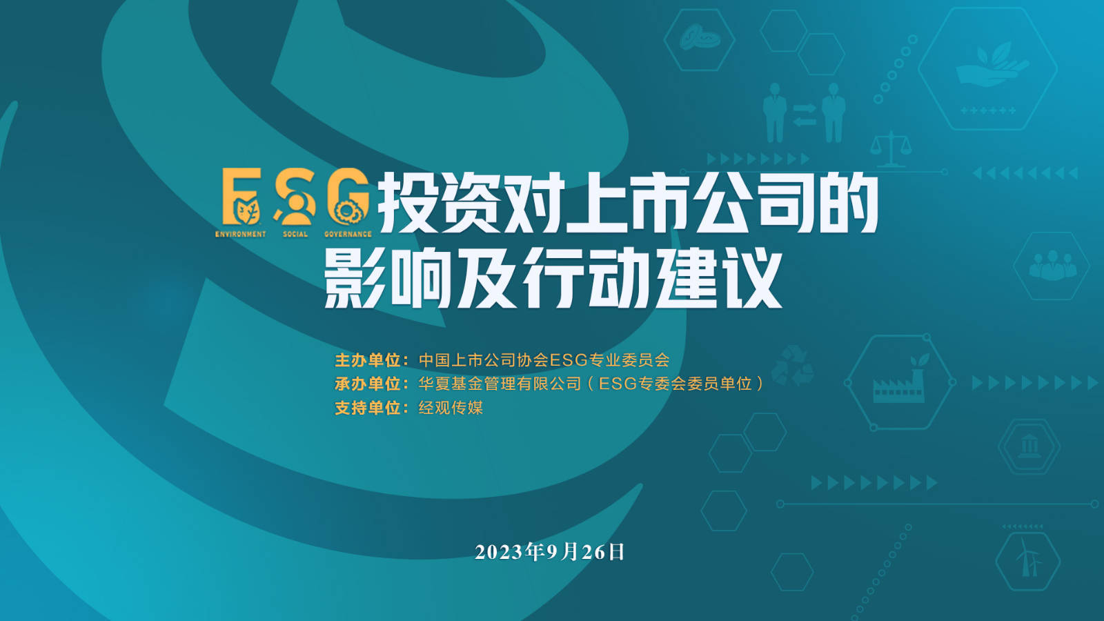 2023年9月26日,中国上市公司协会ESG专业委员会(以下简称“委员会”)举办第三期ESG主题沙龙,主题为“ESG投资对上市公司的影响及行动建议”。本次沙龙由委员单位华夏基金承办,经观传媒作为支持单位,以线上结合线下的方式举办。线上通过直播平台向协会会员单位、委员会委员开放,在线观看数量达25.72万人次。协会党委委员、副会长潘春生,委员会主任委员、中国石化副总裁、董事会秘书黄文生,委员会副主任委员、工商银行董事会秘书官学清、华夏基金总经理李一梅等出席活动。中国移动、邮储银行、中国中冶、兴业证券、中金公司、申万宏源、百度、碧水源、新希望、华熙生物等50余位上市公司代表,以及嘉实基金、鹏华基金、银华基金、美银证券、东方汇理、中国证券投资基金业协会、UN PRI(联合国责任投资原则)等10余位投资机构或组织代表参会。