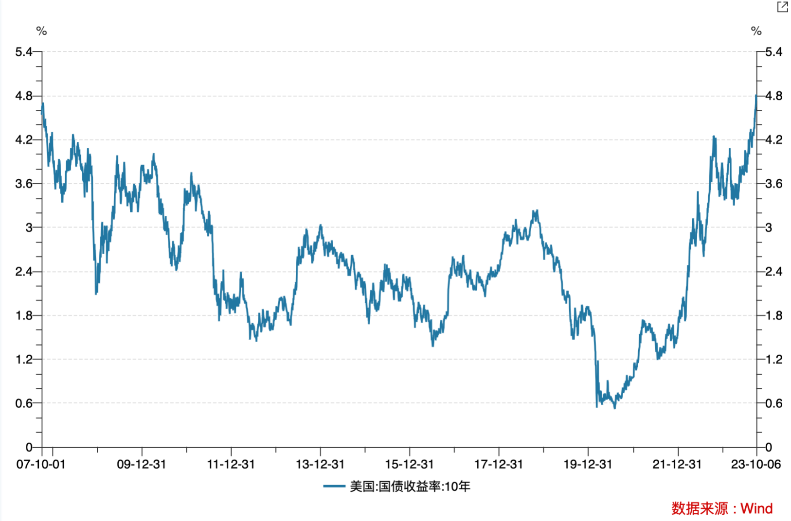 中国国庆长假期间,美债收益率大幅冲高。Wind数据显示,截至10月3日收盘,10年期美债收益率收报4.81%,创下自2007年10月以来的新高。