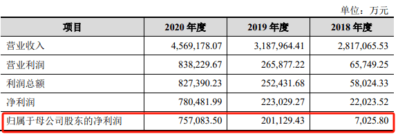 在此背景下,正大股份2021年5月的首份申报稿,其业绩极为惊艳。正大股份2018年至2020年营业收入分别为281.71亿元、318.8亿元、456.92亿元,归母净利润分别为7025.8万元、20.11亿元、75.71亿元。归母净利润在短短的时间里,便实现了超百倍的增长。