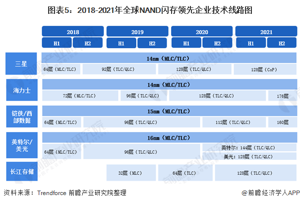 六大厂商推陈出新。根据全球NAND闪存厂商的技术线路图,三星、海力士、美光都计划在2020年推出128层的(TLC/QLC),而在2020年后,QLC将逐步发展并成为主流。在2018年后,中国的长江储存技术出现在世界视野中,中国NAND Flash厂商长江存储(YMTC)已在2020年第一季将128层3D NAND样品送交存储控制器厂商,目标第三季进入投片、年底前量产,拟用于UFS、SSD等各类终端产品,并同时出货给模组厂。