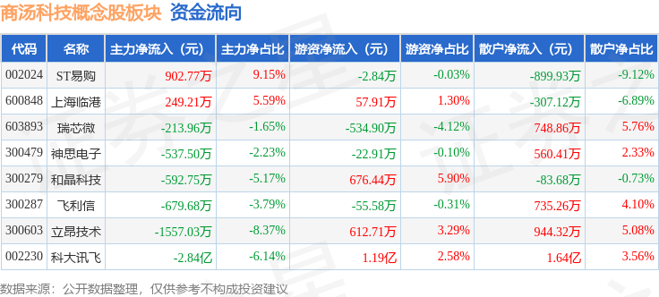 从资金流向上来看,当日商汤科技概念股板块主力资金净流出3.08亿元,游资资金净流入1.27亿元,散户资金净流入1.81亿元。商汤科技概念股板块个股资金流向见下表: