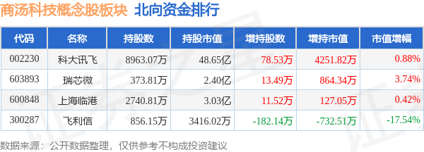 北向资金方面,当日商汤科技概念股板块北向资金持股市值为54.42亿元,增持0.45亿元。其中增持最多的是科大讯飞,增持了0.43亿元。减持持最多的是飞利信,减持了732.51万元。商汤科技概念股板块北向资金持股变动明细见下表: