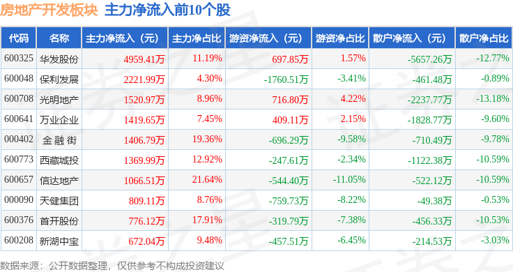 从资金流向上来看,当日房地产开发板块主力资金净流出6.16亿元,游资资金净流入2655.04万元,散户资金净流入5.9亿元。房地产开发板块个股资金流向见下表: