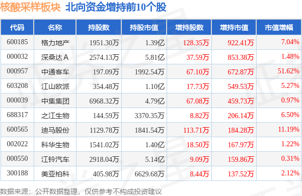 北向资金方面,当日核酸采样板块北向资金持股市值为43.13亿元,增持552.4万元。其中增持最多的是格力地产,增持了922.41万元。减持持最多的是机器人,减持了0.21亿元。核酸采样板块北向资金持股变动明细见下表: