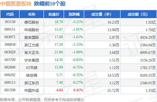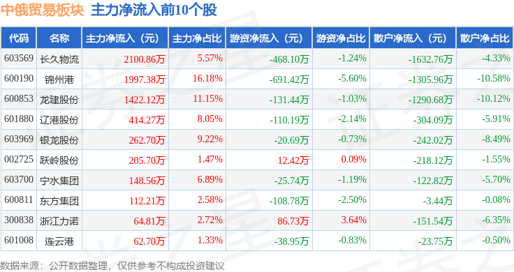 北向资金方面,当日中俄贸易板块北向资金持股市值为13.34亿元,增持0.14亿元。其中增持最多的是中国外运,增持了0.11亿元。减持持最多的是吉大正元,减持了868.66万元。中俄贸易板块北向资金持股变动明细见下表:
