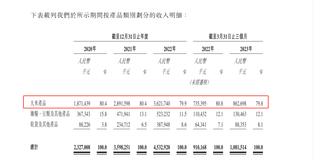 招股书显示,十月稻田是中国厨房主食食品企业之一,提供大米、杂粮、豆类及干货产品,并成功打造十月稻田及柴火大院两个旗舰核心品牌矩阵。根据弗若斯特沙利文报告,在中国厨房主食食品市场按收入计的前五名企业中,十月稻田是于2020年至2022年按收入的年复合增长率计增长最快的企业。截至2022年度,市场份额为14.2%,是行业第二名市场份额的2.7倍。