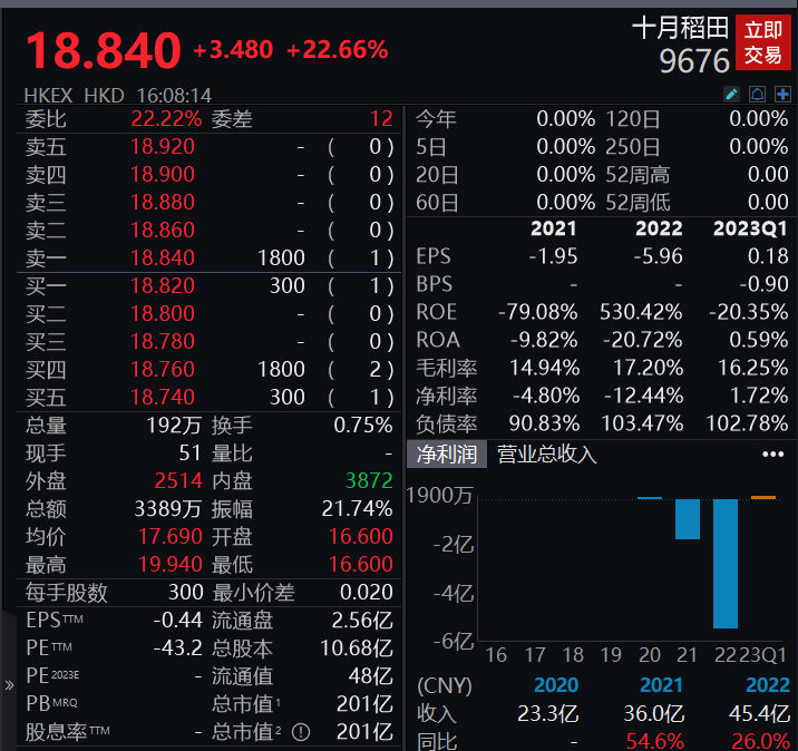 今日十月稻田正式登陆港股,发行价15.36港元,每手300股,最低入场费4787.81港元。截至收盘,十月稻田首日大涨22.66%,报18.84港元,总市值达到201亿港元。