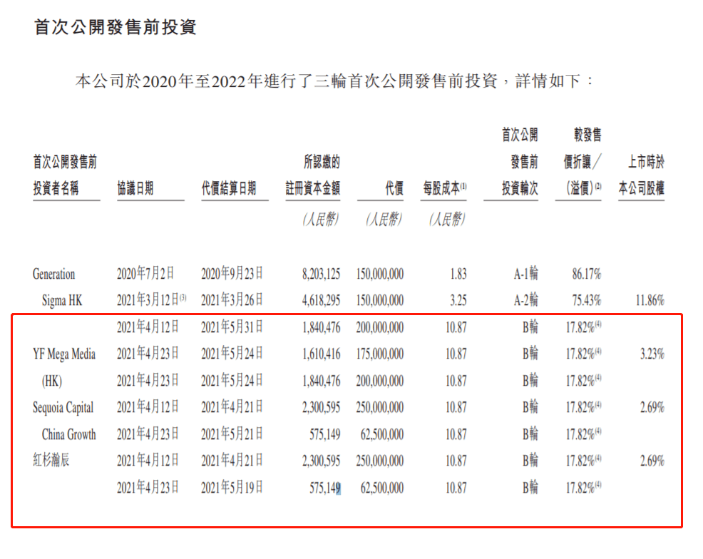 2020年7月,Generation Sigma HK Investment Limited(实控人为启承资本)参与A轮融资认购,投资金额3亿元,成为公司首位外部投资人,A轮融资时公司估值10亿元,2021年5月,启承资本又参与B轮融资并投资2亿元,成为唯一一家连续投了两轮的投资机构。