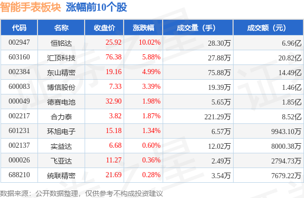 证券之星消息,10月12日智能手表板块较上一交易日上涨0.04%,恒铭达领涨。当日上证指数报收于3107.9,上涨0.94%。深证成指报收于10168.49,上涨0.83%。智能手表板块个股涨跌见下表: