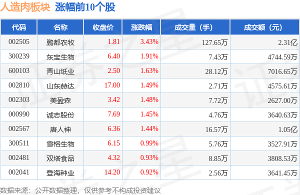 证券之星消息,10月12日人造肉板块较上一交易日上涨0.44%,鹏都农牧领涨。当日上证指数报收于3107.9,上涨0.94%。深证成指报收于10168.49,上涨0.83%。人造肉板块个股涨跌见下表:
