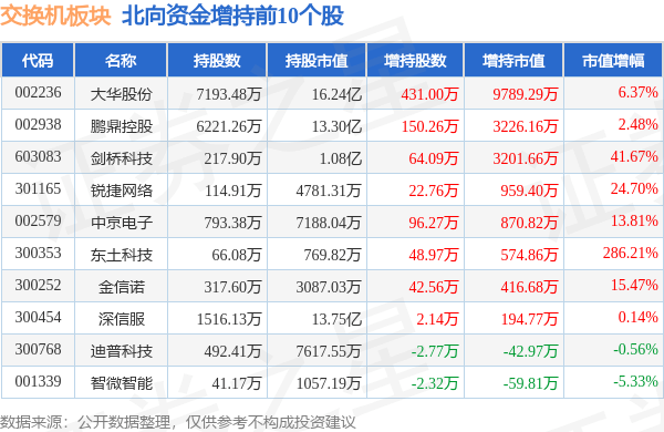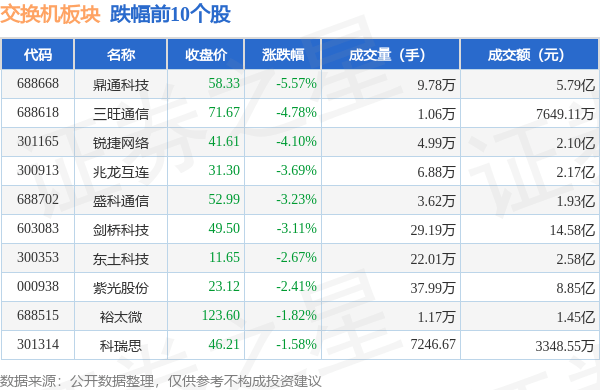 北向资金方面,当日交换机板块北向资金持股市值为166.96亿元,减持2.46亿元。其中增持最多的是大华股份,增持了0.98亿元。减持持最多的是中兴通讯,减持了2.3亿元。交换机板块北向资金持股变动明细见下表: