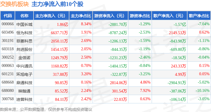 从资金流向上来看,当日交换机板块主力资金净流出4.92亿元,游资资金净流入2228.09万元,散户资金净流入4.7亿元。交换机板块个股资金流向见下表: