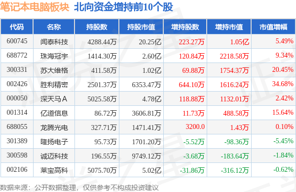 北向资金方面,当日笔记本电脑板块北向资金持股市值为161.05亿元,增持0.15亿元。其中增持最多的是闻泰科技,增持了1.05亿元。减持持最多的是胜宏科技,减持了0.41亿元。笔记本电脑板块北向资金持股变动明细见下表: