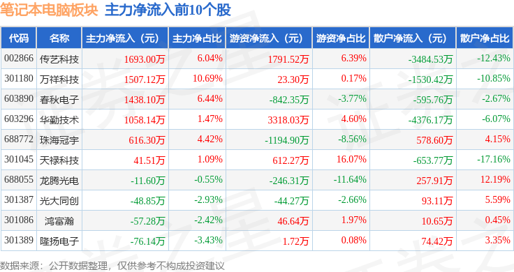 从资金流向上来看,当日笔记本电脑板块主力资金净流出2.96亿元,游资资金净流入6433.28万元,散户资金净流入2.32亿元。笔记本电脑板块个股资金流向见下表:
