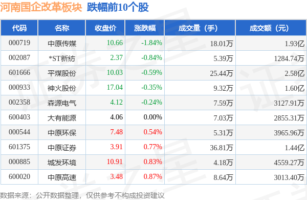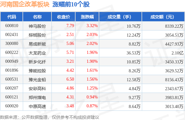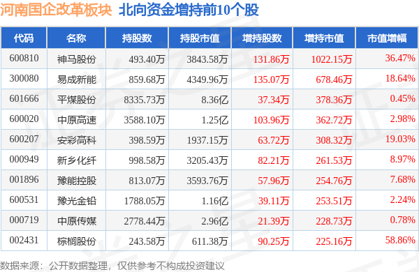 北向资金方面,当日河南国企改革板块北向资金持股市值为27.66亿元,增持0.46亿元。其中增持最多的是神马股份,增持了0.1亿元。减持持最多的是大有能源,减持了148.31万元。河南国企改革板块北向资金持股变动明细见下表: