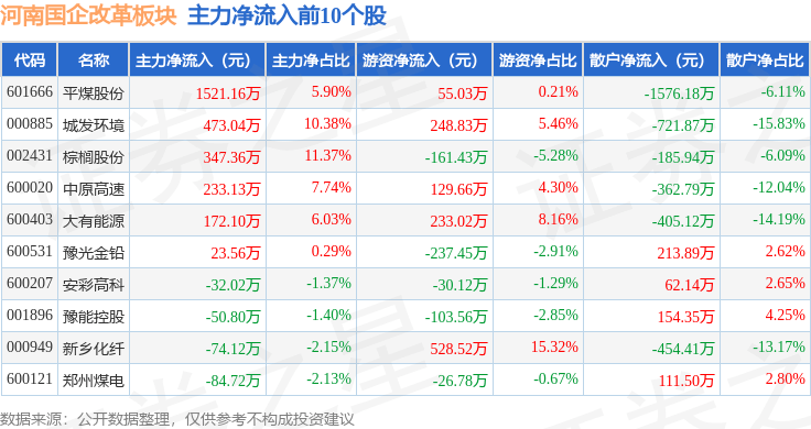 从资金流向上来看,当日河南国企改革板块主力资金净流出2866.57万元,游资资金净流入4104.16万元,散户资金净流出1237.59万元。河南国企改革板块个股资金流向见下表: