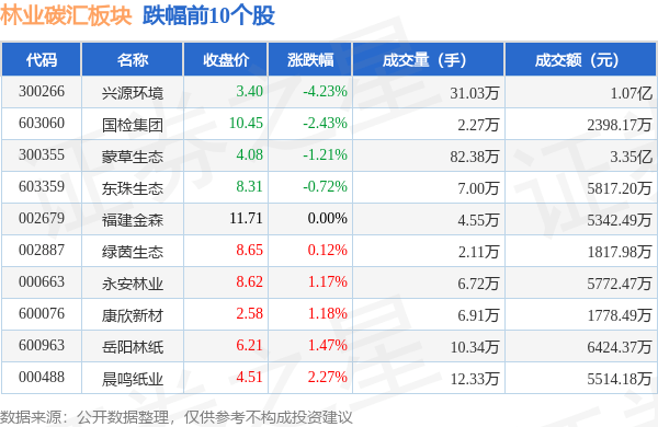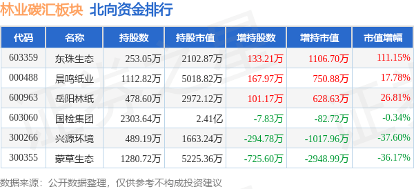 北向资金方面,当日林业碳汇板块北向资金持股市值为4.11亿元,减持0.16亿元。其中增持最多的是东珠生态,增持了0.11亿元。减持持最多的是蒙草生态,减持了0.29亿元。林业碳汇板块北向资金持股变动明细见下表: