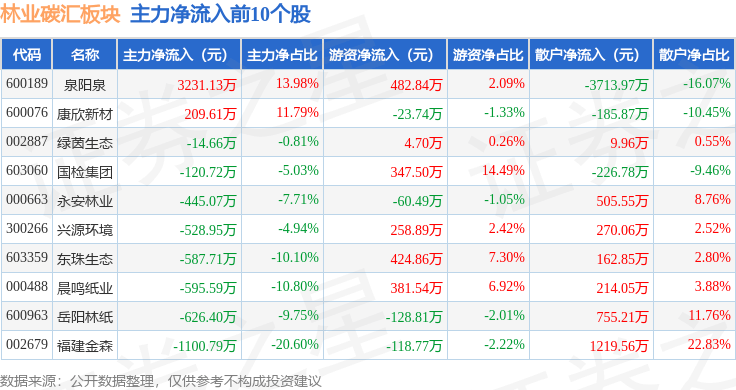从资金流向上来看,当日林业碳汇板块主力资金净流出6423.29万元,游资资金净流入3090.96万元,散户资金净流入3332.33万元。林业碳汇板块个股资金流向见下表: