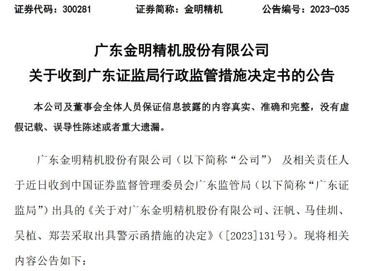 广东证监局指出,金明精机业绩预告与年度报告中披露的相关数据相比差异较大,且涉及盈亏变化,信息披露不准确。同时,公司迟至2023年3月17日才披露业绩预告修正公告,存在修正公告披露不及时的情形。上述行为违反了《上市公司信息披露管理办法》(证监会令第182号)第三条等相关规定。