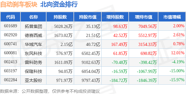北向资金方面,当日自动刹车板块北向资金持股市值为100.5亿元,增持1.31亿元。其中增持最多的是拓普集团,增持了0.7亿元。减持持最多的是亚太股份,减持了0.18亿元。自动刹车板块北向资金持股变动明细见下表: