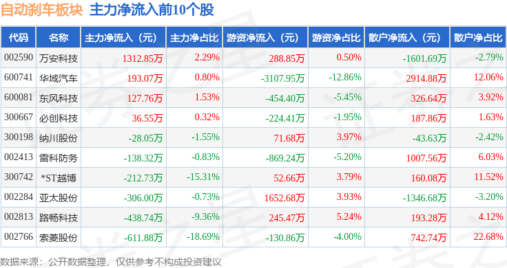 从资金流向上来看,当日自动刹车板块主力资金净流出2.06亿元,游资资金净流入1.01亿元,散户资金净流入1.04亿元。自动刹车板块个股资金流向见下表: