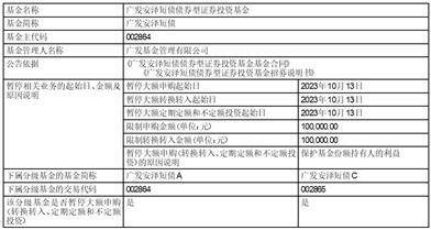 广发基金管理有限公司(以下简称“本公司”)决定自2023年10月13日起,广发安泽短债债券型证券投资基金(以下简称“本基金”)暂停机构投资者单日单个基金账户申购(含定期定额和不定额投资)及转换转入本基金合计超过100,000.00元的大额业务。即如机构投资者单日单个基金账户申购(含定期定额和不定额投资)及转换转入本基金的申请金额大于100,000.00元,则100,000.00元确认成功,超过100,000.00元(不含)金额的部分将有权确认失败;如机构投资者单日单个基金账户多笔累计申购(含定期定额和不定额投资)及转换转入本基金的金额大于100,000.00元,按申请金额从大到小排序,本公司将逐笔累加至100,000.00元的申请确认成功,其余超出部分的申请金额本公司有权确认失败。
