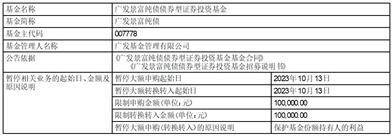 广发基金管理有限公司(以下简称“本公司”)决定自2023年10月13日起,广发景富纯债债券型证券投资基金(以下简称“本基金”)调整机构投资者单日单个基金账户申购及转换转入本基金的业务限额为100,000.00元。即如机构投资者单日单个基金账户申购及转换转入本基金的申请金额大于100,000.00元,则100,000.00元确认申购成功,超过100,000.00元(不含)金额的部分将有权确认失败;如机构投资者单日单个基金账户多笔累计申购及转换转入本基金的金额大于100,000.00元,按申请金额从大到小排序,本公司将逐笔累加至100,000.00元的申请确认成功,其余超出部分的申请金额本公司有权确认失败。