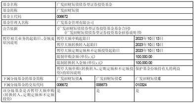广发基金管理有限公司(以下简称“本公司”)决定自2023年10月13日起,广发招财短债债券型证券投资基金(以下简称“本基金”)暂停机构投资者单日单个基金账户申购(含定期定额和不定额投资)及转换转入本基金合计超过100,000.00元的大额业务。即如机构投资者单日单个基金账户申购(含定期定额和不定额投资)及转换转入本基金的申请金额大于100,000.00元,则100,000.00元确认申购成功,超过100,000.00元(不含)金额的部分将有权确认失败;如机构投资者单日单个基金账户多笔累计申购(含定期定额和不定额投资)及转换转入本基金的金额大于100,000.00元,按申请金额从大到小排序,本公司将逐笔累加至100,000.00元的申请确认成功,其余超出部分的申请金额本公司有权确认失败。
