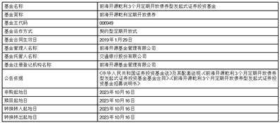 风险提示:本基金本次开放日期为2023年10月16日至2023年10月17日,并自2023年10月18日起进入下一个封闭期,封闭期内本基金不接受申购、赎回及转换申请。另外,本基金将会根据本次开放期的申购、赎回规模情况决定是否调整本次开放期间,敬请留意本公司相关公告。