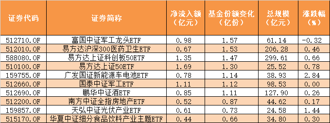 接着是易方达沪深300医药卫生ETF,微涨0.46%,份额增加1.53亿份,净流入额0.67亿元;