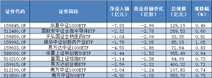 华夏中证1000ETF,大涨0.49%,份额则大减2.99亿份,净流出额7.33亿元;