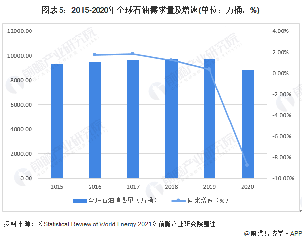 根据《BP世界能源统计年鉴2021》数据,2015-2020年,全球石油消费量总体呈现增长趋势。2019年,全球石油消费量为9759.8万桶,同比上升0.34%。2020年受疫情影响,全球石油需求出现大幅下滑,2020年同比下滑3.8%,至8847.7万桶。