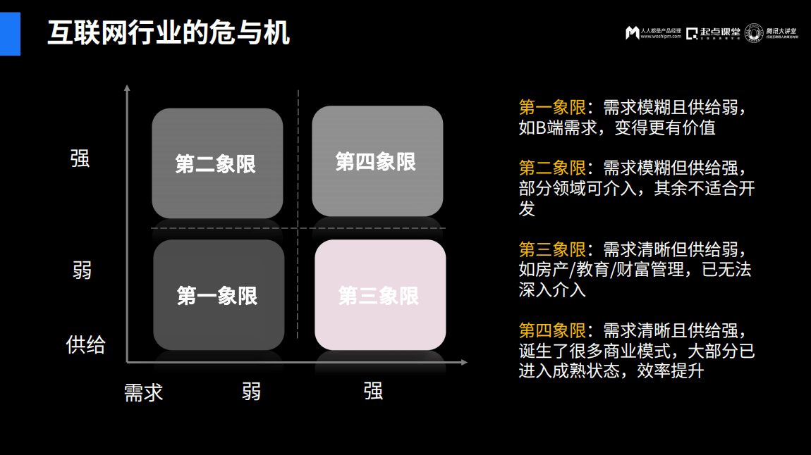 再看回这四个象限,除第二象限外,其他三个象限已经进入瓶颈期,所以可以看到,不少互联网公司都在第二象限发力,只是所需的深耕时间会相对较长。总的来说,如果未来想求发展,就要向第三产业要效率,向第二产业求改造,向海外输出求扩张。