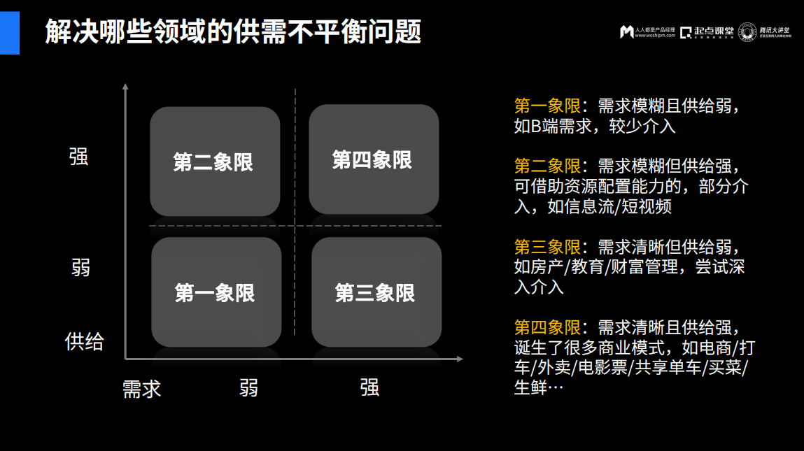下图说明了数字化时代所解决的是哪些领域的供需不平衡问题,纵轴为供给,横轴为需求,总共有四个象限。