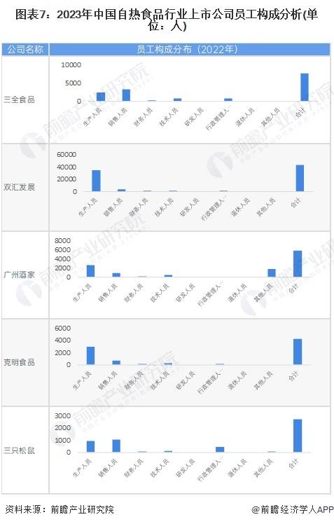 从自热食品行业的上市企业已有的公开信息分析,员工总数最多的企业是双汇发展,员工总数为43669人;其次是三全食品,员工总数7638人。技术人员最多的是双汇发展,技术人员总数为1586人;其次是三全食品,技术人员数量859人。销售人员数量最多的是双汇发展,总数为4132人;其次是三全食品,销售人员数量3343人。