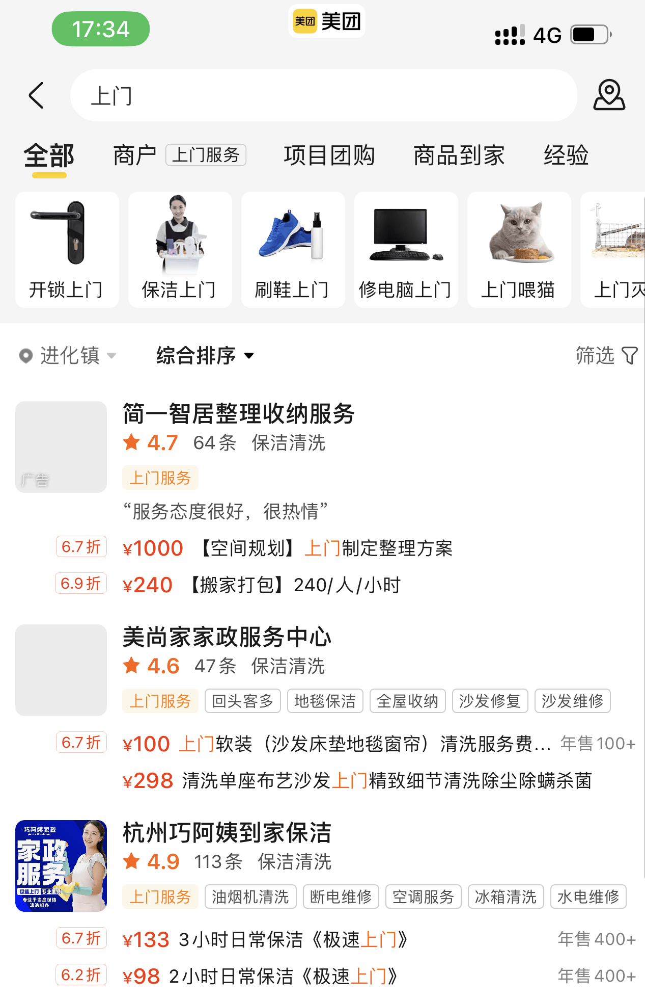 全屋整理收纳上门服务,四人组四小时600元;极速上门日常保洁,3小时133元;50元即可上门除虫灭老鼠;在美团搜索“上门”二字,从上门保洁、上门除虫,到上门育儿、家电急修,诸多新型“保姆式”服务一一呈现。