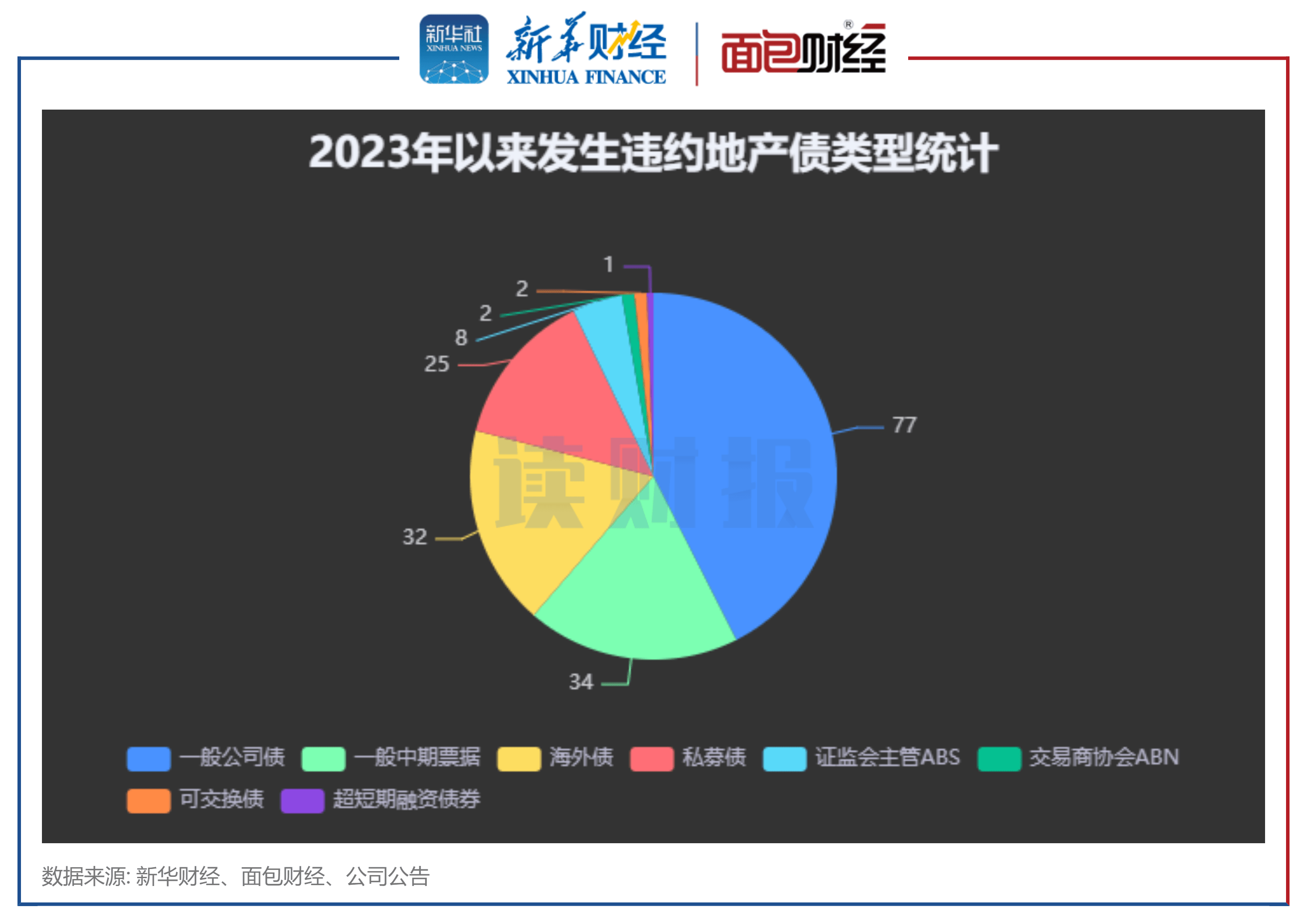 从违约债券类型来看,地产债违约主要集中于一般公司债,违约债券数量达到77只,占比近半;一般中期票据位居其次,为34只。可交换债、超短期融资债券、交易商协会ABN则相对较少,今年以来违约债券数量均低于5只。