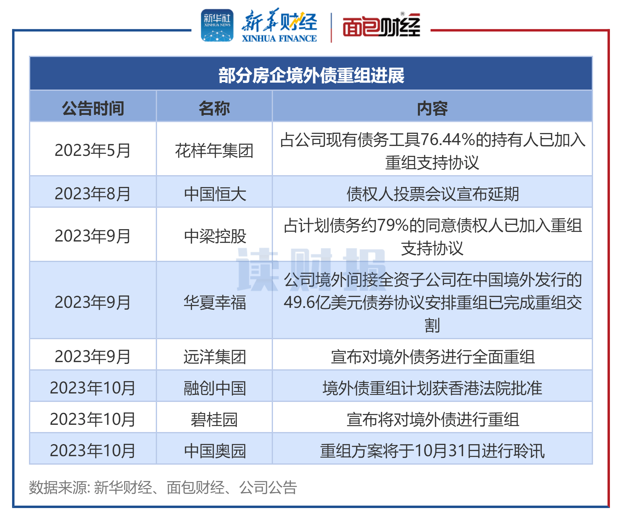 2023年7月,中国奥园披露境外债务重组方案,公司将发行新的融资工具对原债券进行置换,包括4支共计23亿美元的新债务工具期限至2031年,14亿股普通股、1.43亿美元无息强制可转换债券、16亿美元永续债。8月,持有奥园现有票据本金金额75.89%的债权人已正式签署或同意重组支持协议。10月11日,中国奥园公告披露境外重组进展称,公司已经向相关法院申请召开债权人会议,相关聆讯时间定在2023年10月31日举行。