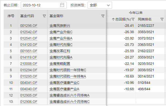 “老将”倪超的业绩表现也难言理想,他的代表作品金鹰行业优势A是除金鹰民族新兴混合外年内亏损最多的一只,截至10月12日,年内总回报-16.47%,同类排名2782/3521,处于中部靠后。