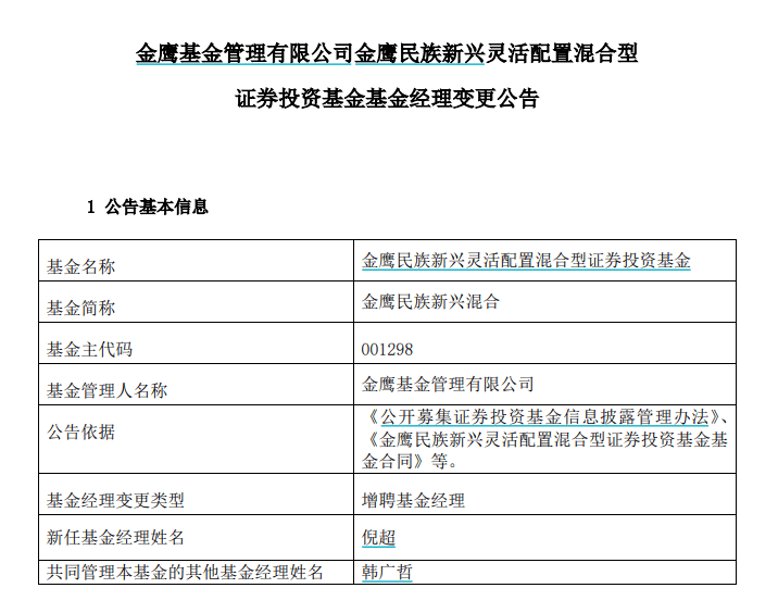 10月10日,金鹰民族新兴混合发布基金经理变更公告,增聘倪超为基金经理,与韩广哲共同管理本基金。公开信息显示,倪超于2009年7月加入金鹰基金,现任权益研究部总经理、基金经理,担任基金经理超过8年。
