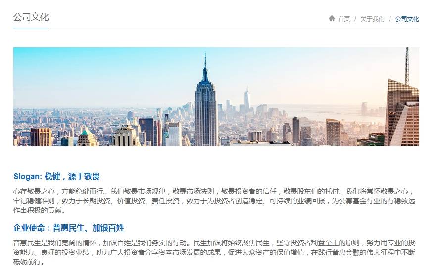 民生加银基金企业文化中的重要一条是“稳健”,公司“致力于长期投资、价值投资、责任投资,致力于为投资者创造稳定、可持续的业绩回报,为公募基金行业的行稳致远作出积极的贡献。”