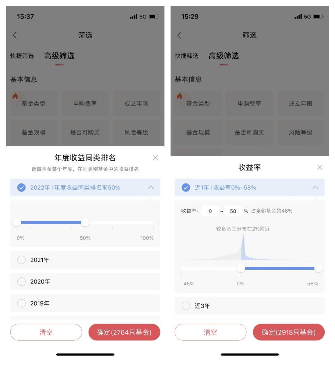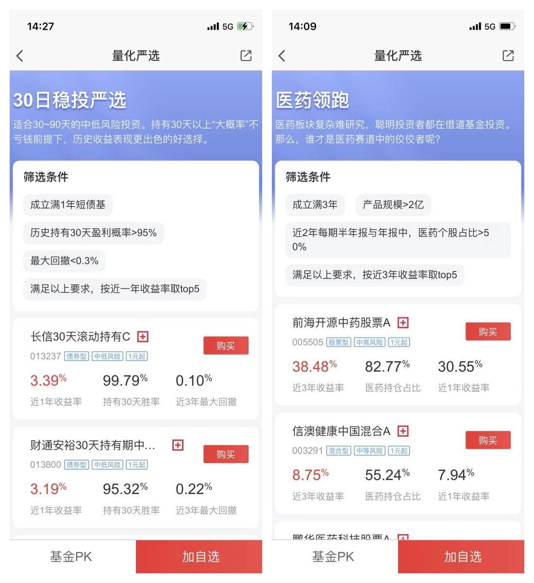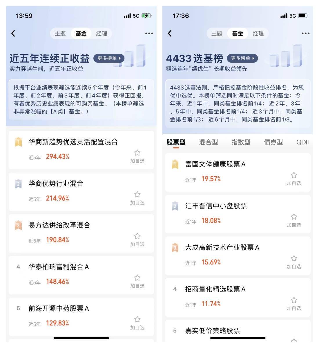 支持对不同类型的基金,根据收益指标、风险指标、特色指标等进行排序筛选。