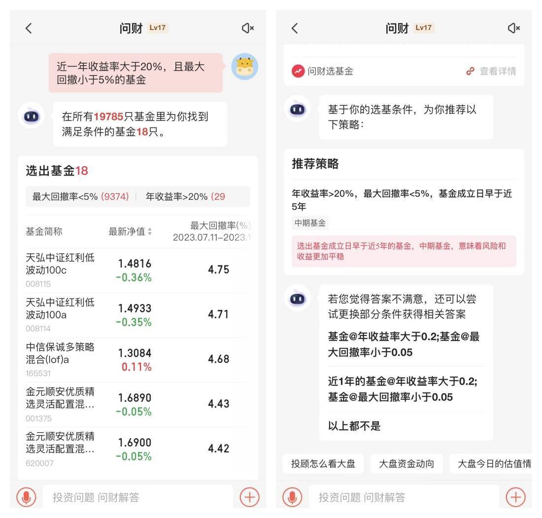 对话式的智能顾问,尤其是开放式对话的模式,对语义的解析和内容的提供有着极高的技术要求,目前处于领先地位的是同花顺的问财助手,基本上实现了常用金融指标解析,并支持多指标组合和进一步的推荐。