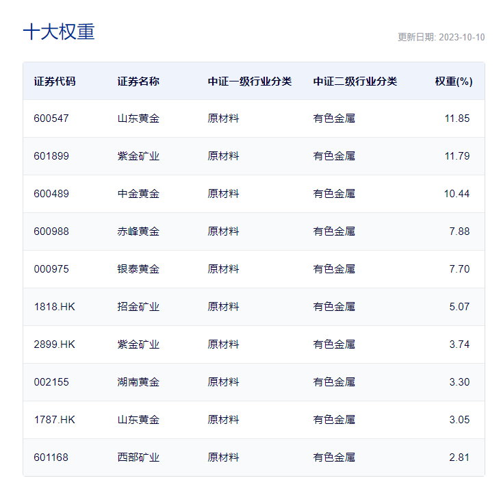前十大成份股囊括山东黄金、紫金矿业、中金黄金等知名黄金产业上市公司。