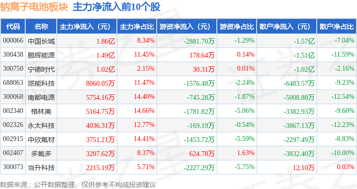 从资金流向上来看,当日钠离子电池板块主力资金净流入7.37亿元,游资资金净流出4210.22万元,散户资金净流出6.95亿元。钠离子电池板块个股资金流向见下表: