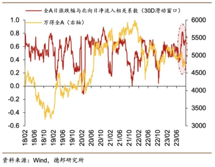 图6 近日北向资金日度净流入与大盘涨跌相关性较高