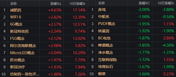 板块方面,5.5G、减肥药、华为·手机、CRO等板块涨幅居前,啤酒、AIGC、新型工业化、BC电池等板块跌幅居前。