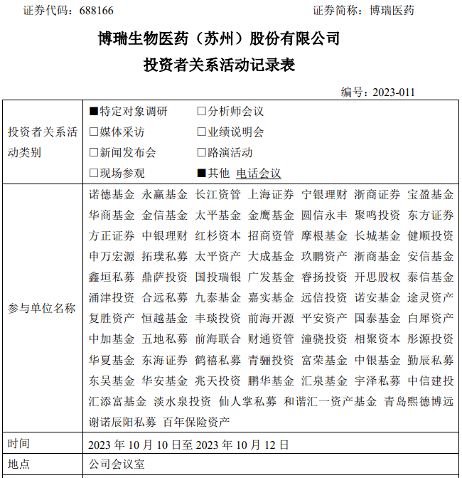 昨晚,博瑞医药披露的投资者调研报告显示,10月10日-12日,公司接待了大量的机构投资者。