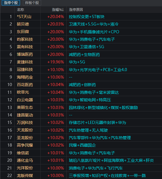 从今日涨停个股所属的概念来看,华为、减肥药两大阵营基本分庭抗礼,此外还有部分汽车相关产业链个股。