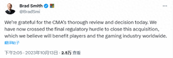 而微软总裁布拉德·史密斯在twitter(X)发文,感谢了CMA的批准。